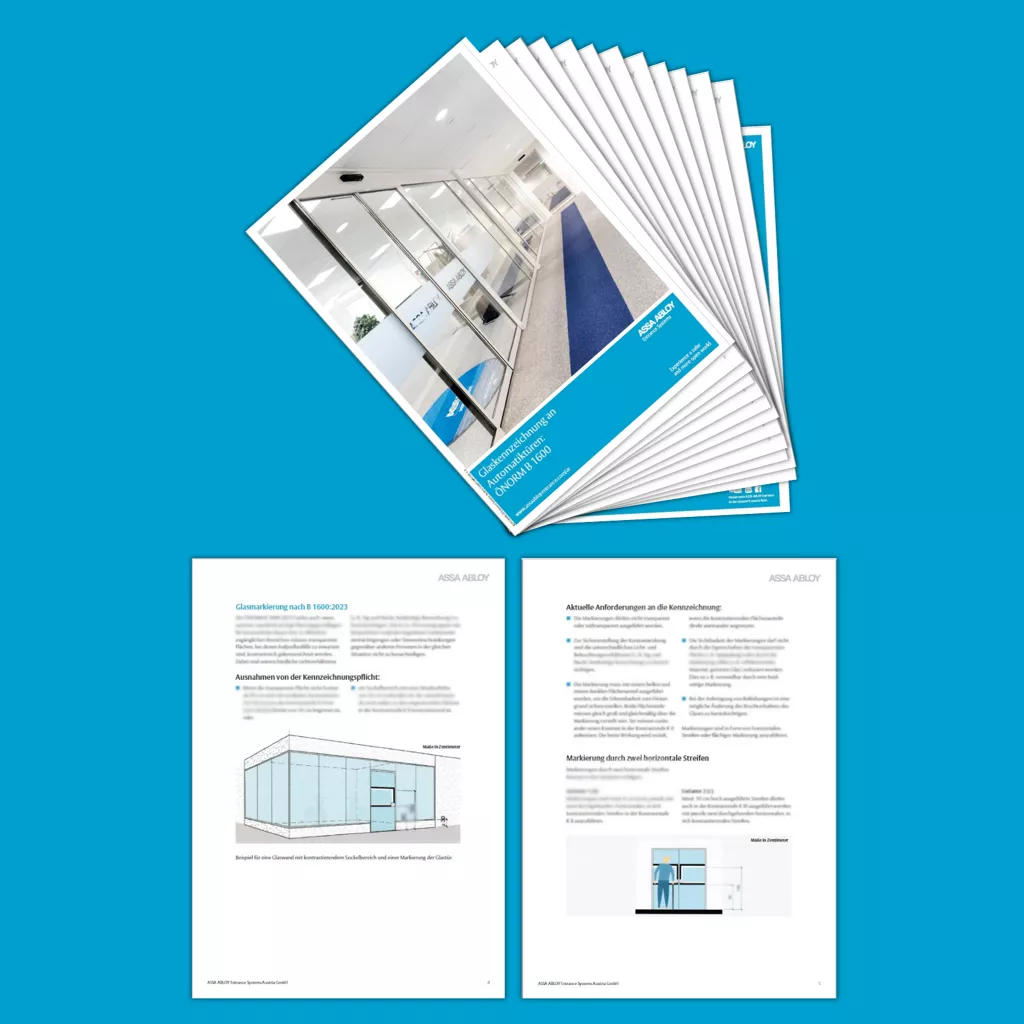 Die ÖNORM B 1600 legt die Anforderungen für barrierefreies Bauen fest, einschließlich Glas- und Türmarkierungen: Transparente Flächen in öffentlichen Bereichen müssen markiert werden, um Aufprallunfälle zu verhindern.