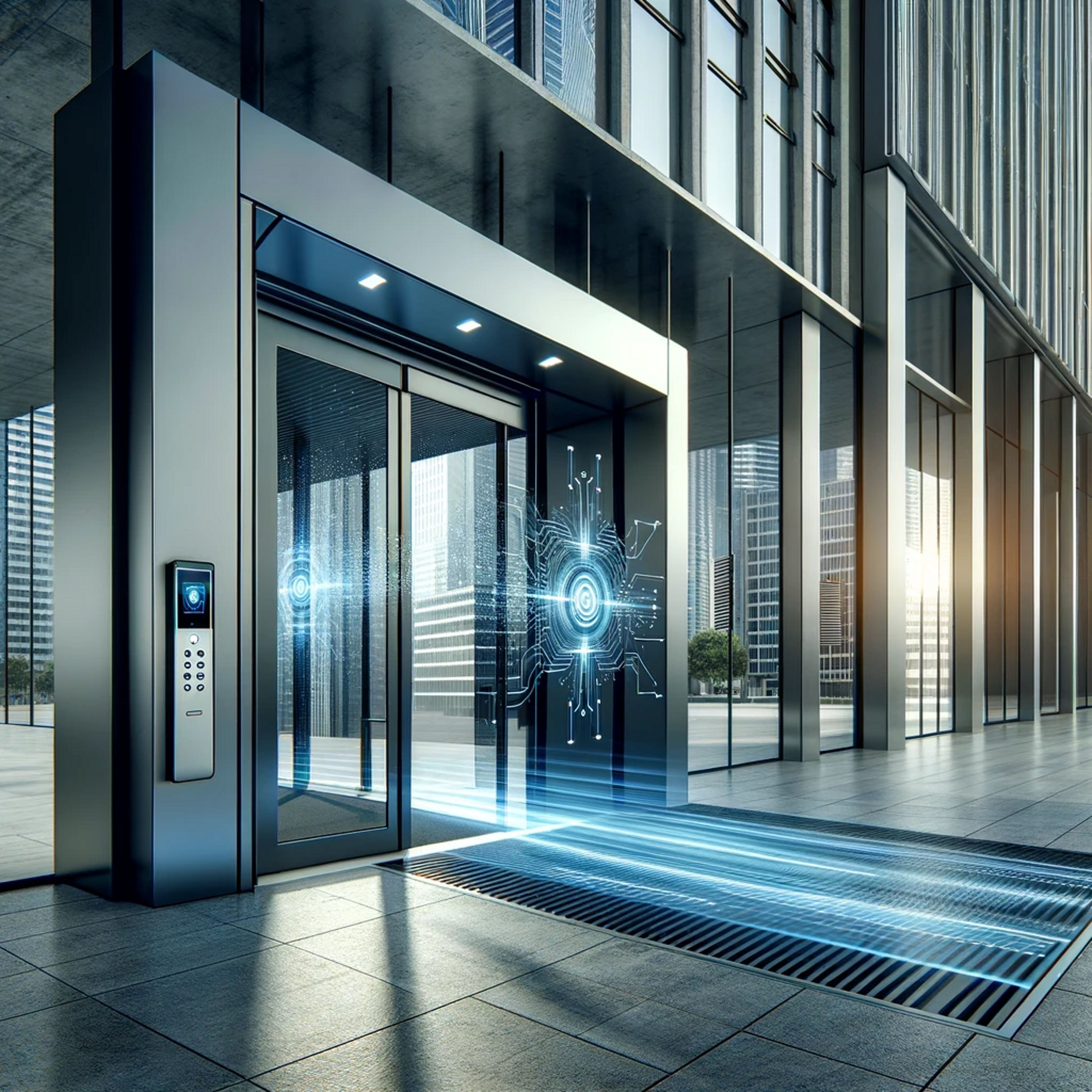 Das Bild ist KI-generiert und zeigt ein hochmodernes automatischen Schiebetürsystem im Zusammenspiel von Funktionalität und futuristischem Design.