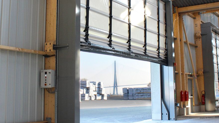 Grande porte souple automatique jusqu'à 11 x 11 m à repliement pour une meilleure résistance et isothermie. Sa structure est indépendante, autostable et rigide. La motorisation directe est intégrée dans la traverse avec un nombre réduit de pièces en mouvement pour une maintenance facilitée et une meilleure longévité. Nombreuses options disponibles de transparence, d'épaisseur d'écran, d'ouverture sans courant et de formes de traverse pour un accès à la motorisation par le devant, le dessus ou le dessous. Ses glissières amples autorisent un fonctionnement continu même en cas de déformation accidentelle des raidisseurs.