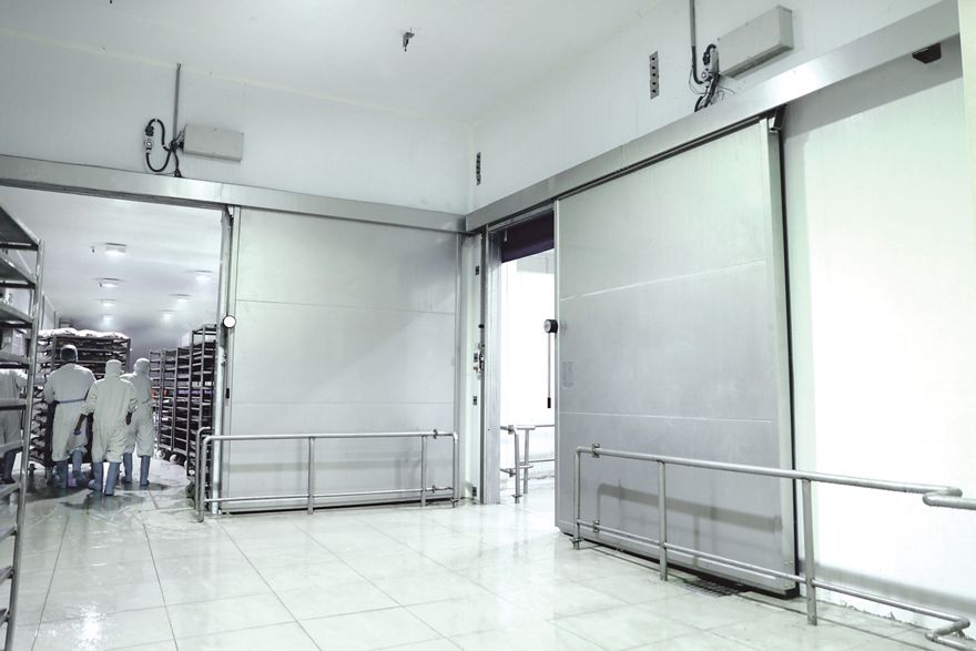 An industrial sliding door suitable for cooled spaces.
