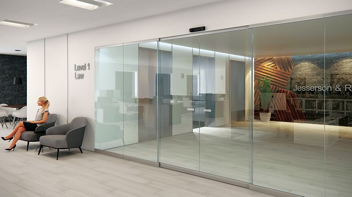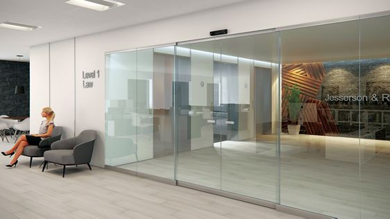 Güzel, şeffaf uygulamalar için ASSA ABLOY SL500 R Yarı Şeffaf otomatik kayar kapı sistemi.